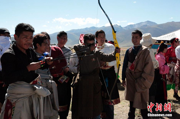 圖為青海省玉樹藏族自州當(dāng)?shù)孛癖娺M行射箭比賽來慶?!般逶」?jié)”到來。來源:中新社 攝影:孫睿