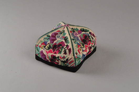 “曼甫朵帕”此款花帽是由手工刺繡成的,四瓣以帽頂為中心拼接縫合,套模成型,以黑絨鑲邊,四棱可折疊。每一瓣三角形內(nèi)以一個或兩個單獨(dú)紋樣,一條邊緣紋樣構(gòu)成一組適合紋樣,這種紋樣簡練、構(gòu)圖嚴(yán)謹(jǐn)?shù)幕眻D案稱為單獨(dú)適合紋樣花帽,維吾爾語稱“曼甫朵帕”。此花帽紋樣大都是以新疆花卉、果實(shí)等自然形態(tài)為素材,加以藝術(shù)的提煉、概括、夸張、變化而使之成為具有濃郁鄉(xiāng)土氣息和強(qiáng)烈民族情趣,圖案有花卉、果實(shí),造型有石榴花、桃花、杏花、麥穗,還有星月、雪花等。此外還大量運(yùn)用了富有變化的幾何圖案。布底為一色平線,圖案則用優(yōu)質(zhì)彩色絲線混合棉線刺繡而成,形成底色和花色對比強(qiáng)烈,艷麗奪目。