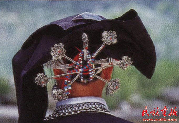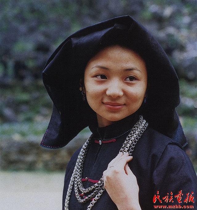 婦女的服飾更具特點(diǎn),無論老少,都喜歡穿右蓋大襟和葫蘆狀矮腳圓領(lǐng)的緊身短式上衣,下身以寬褲腳、大褲頭的褲子相搭配,腰系黑布做成的大圍裙,頭帶黑布大頭巾。其圍裙既寬且長,戴時(shí)能系周身有余,裙底垂掛到小腿下部,圍裙不僅作為裝飾,而且可以作為勞動工具,遇趕圩或走親訪友和勞動時(shí),可將圍裙底翻卷上來作成小包袱,用以包裝和盛裝物品。婦女頭巾都是一塊自己紡織染成的長條黑布,戴時(shí)先圍繞在頭上,然后翻折擺布成火棱形的圖樣,罩在整個(gè)頭上,再把頭巾的兩端分別垂掛到雙肩上,看上去樸素美觀。同時(shí)還可以當(dāng)做帽子遮蔭用。她們的衣邊、衣角、袖口、裙邊和頭巾的四邊都用紅布或黃布剪成小條以后鑲捆上去,有的則用紅、黃、藍(lán)色絲線繡成波浪形的線條,使黑中襯出紅、黃、藍(lán)色的線條來,清雅明亮,色彩協(xié)調(diào)。再加上頭發(fā)插著龍頭形的銀簪,頸項(xiàng)上帶有銀鏈或項(xiàng)圈,手帶銀圈、玉鐲,耳掛珍珠耳環(huán)等,使人一看,黑中閃艷,樸素之中亦有玲瓏之美,表現(xiàn)了她們獨(dú)特的審美觀。