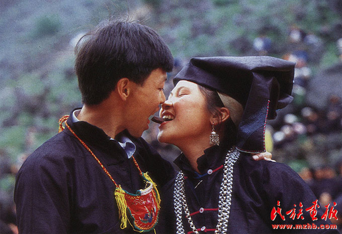 黑衣壯青年男女的戀愛熱情浪漫,一個(gè)個(gè)扔向簸箕的香包和紅帶子,不久就會連接兩顆年輕的心,引出一段醉心動人的愛情故事