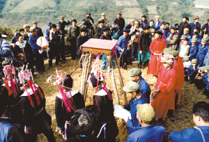 “跳五臺”可算是儀式中較為引人注目的。在村邊的一塊場地中央搭好一座約兩米高的木臺,叫做“五臺”。受戒的弟子們同樣帶著草帽,身穿紅袍,由師父帶領(lǐng)走向五臺。在鑼鼓聲中,繞五臺三圈,繞畢盤腿坐好。師傅叫到誰,誰就起來,在師父的指引下,沿木梯爬上高臺。蹲在五臺上的受戒者,雙手十指交錯,小心翼翼地向后移動到桌邊,然后翻落于藤網(wǎng)之中,由網(wǎng)中的棉被將受戒者包住。師父掀開棉被,見受戒者十指仍然穩(wěn)扣,坐像端端正正,表示度戒成功。十幾位弟子輪番上臺,每位都順利通過。受戒弟子的父母和鄉(xiāng)親們都為他們的成功而歡喜。