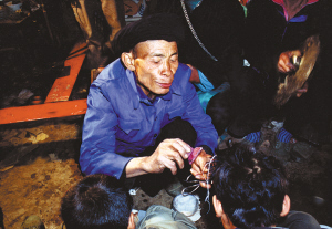 受戒儀式前前后后要舉行好幾天,一般依照受戒者家的經(jīng)濟(jì)條件來定。時(shí)間短的叫“小辦”,時(shí)間長的稱“大辦”。但其中有一條,不論時(shí)間長短,度戒中的規(guī)矩是不能違背的。這次十幾位受戒者合起來辦的度戒,聽說是七天七夜的“大辦”。在這幾天中,受戒者必須嚴(yán)禁會客、社交、唱歌等,只能低頭修身養(yǎng)性,吃清淡無油的飯和水。度戒中最重要的一件事是聘請師父,有“度師”和“度道”之分,師傅自然有“師公”和“道公” 之分。師宗縣藍(lán)靛瑤中的度師為武戒,師公要負(fù)責(zé)“五臺” 受戒儀式。度道為文戒,道公身穿紅色法衣,負(fù)責(zé)念經(jīng)求神等儀式。受戒祭師一般由德高望重的長者擔(dān)任,他們是寨中一切主要事務(wù)的決策者,也是寨中最有學(xué)問的人。在受戒儀式中,他們要對弟子進(jìn)行族史、族規(guī)、社會道德等多方面的教育。