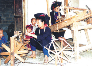 紡紗、織布、藍染,是哈尼族婦女制作服裝的重要組成部分。她們在織布前要做的準備工作,就是操動制線機,把一根根短小的線連接起來,捲在小木棍上,然后操動絞線機,把線棍上的線分開絞在木梭子和木輪子上。接著是分線,人數(shù)不限,但不能少于5人,一般10米為一組線??棽紩r,在織布機上方搭起兩排密集的線網(wǎng),當雙腳踩動踏板時,兩排線網(wǎng)一上一下地交叉移動,將拖著線的梭子一次次地左右穿梭于線網(wǎng)中。這樣重復地進行,就織出一筒筒布,一般10米為一筒布。最后把織成的布放入靛缸里泡洗,曬干后就可以制作服裝了。