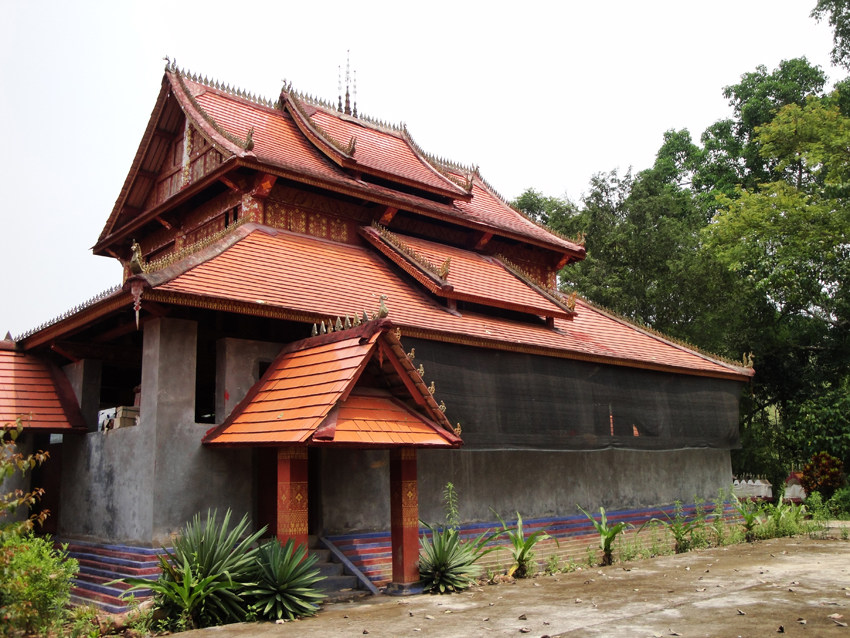佛寺建筑是信仰小乘佛教的傣族地區(qū)建筑的一大特色,以落地重檐多坡面平瓦建筑為主。由大殿、僧舍和鼓房組成,中心佛寺外加一座戒堂、一座藏經(jīng)樓、一座佛塔。主殿外觀一般是單檐或重檐歇山式屋頂,或懸山式頂、多角或亞字形重檐歇山式頂。坡面進行一至二次跌落后有兩層或上中下三層的單面坡或三面坡、五面坡,坡面的多少和佛寺的級別有關(guān)。屋面按縱向分為兩段式或三段式或五段式,以中間最高,使龐大威嚴的屋面呈現(xiàn)出優(yōu)美起伏的曲線。