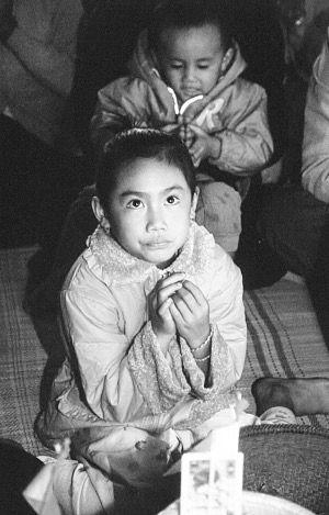 這時,走來一個大佛爺和兩個老人,因為佛祖不會開口說話,他們是來替佛祖給玉波念“薩拉帥”祝詞的。先由大佛爺念了一段《祝福經(jīng)》,給玉波滴了水,然后兩個老人打開玉波那寬半尺、長足有7米多的“薩拉帥”祝詞。玉金說,這祝詞是請曼降村的前大佛爺康朗寫的(康朗:指佛爺還俗的人)。來倆個老人念,是考慮到可以換著念。玉波的奶奶也想到了玉波可能跪不習(xí)慣,就帶來了墊子,讓玉波或跪或坐,因為念完祝詞要兩三個小時。祝詞的內(nèi)容大致是這樣的:“我是一個在菩提樹下長大的女孩,在佛祖的護(hù)蔭下,臉長得像菩提樹葉一樣又嫩又青,身材像檳榔樹一樣苗條好看,心像金鹿一樣善良。當(dāng)我年滿12歲以后,人世間的喜樂情愛,貧窮苦難就會來到我的面前。今天在父母的幫助下,我準(zhǔn)備了這些物品來賧給佛祖。我千祈禱萬祈求,希望佛祖保佑我織布是行家,丈夫種田是能手。命里見火能親,遇水能溶。生的孩子女的長得像一只蜜蜂,男的長得像一頭水牛,用他們的勤勞贍養(yǎng)雙親。從小就聽話,自幼就很乖。在母親的懷里不亂哭,在父親的背上不亂搓……”