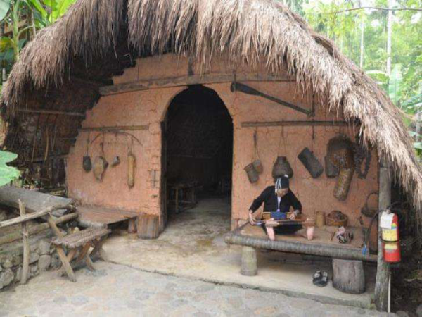 船型屋長而闊,茅檐低矮,這樣的風(fēng)格有利于防風(fēng)防雨。房子分為前后兩節(jié),門向兩端開,茅草屋中間立三根高大的柱子,黎語叫“戈額”,“戈額”象征男人,兩邊立6根矮的柱子,黎語叫“戈定”,“戈定”象征女人,即一個家是由男人和女人組成。墻體用泥土筑成,屋形狹長、屋檐低矮。大多數(shù)的船形屋長14.7米,寬6米,屋高3.2米。房子分為前后兩節(jié)。四壁用樹枝扎成方格形,再用用稻草和泥糊墻。前后兩個門用木板制成,門向兩端開。