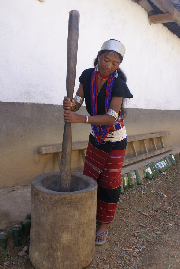 佤族以大米為主食。西盟地區(qū)的佤族都喜歡把菜、鹽、米一鍋煮成較稠的爛飯。其他地區(qū)的佤族則多吃干飯。農(nóng)忙時(shí)日食三餐,平時(shí)吃二餐。雞肉粥如茶花稀飯是家常食品的上品。旱稻多現(xiàn)吃現(xiàn)舂,男女老幼皆食辣椒,民間有“無辣子吃不飽”之說。副食是青菜類、瓜類、酸竹筍、鹽、辣椒、蔥、蒜等。肉食主要是牛、豬、雞、狗以及獵獲的獸、禽、松鼠、田鼠、魚、螺螄、螃蟹、蜂兒等。一些地區(qū)的佤族還有捕食昆蟲的習(xí)慣,更食用蛹、寄生于草木植物的紅毛蟲、掃把蟲和寄生于冬瓜樹的冬瓜蟲等十余種。一般是把可食的昆蟲與米一起煮成粥,加菜、鹽、拌辣椒,香辣可口(兩圖為舂米和舂米用具,劉軍攝影)。