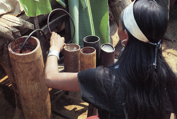 佤族普遍喜飲酒,喝苦茶。所飲用的酒都是自家釀制的“泡水酒”。常飲泡水酒不但于身體無害,反而有益健康。飲水酒成為佤族日常生活中主要的嗜好之一。喝酒時(shí)必須要請(qǐng)親友來家中共飲,主人給客人敬酒有一套規(guī)矩:必須一一敬酒。敬酒時(shí),雙手捧竹酒筒,走到客人面前,弓身把酒筒從自己胸前按下再向上舉到客人嘴邊,主人喝一口,最后敬給客人喝干。如此一一敬酒,直至敬完所有在場(chǎng)的人,漏敬一個(gè),都會(huì)被認(rèn)為是不合“阿佤理”的。敬酒時(shí),第一個(gè)被敬酒的人,通常是在場(chǎng)的客人中最被尊重的人。他接過酒后,先要用右手沾出幾滴,滴在地上,并口念祝福的語言,表示敬主人的祖先(圖為用竹筒制水酒,劉軍攝)。