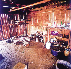 房內(nèi)一般隔成里外兩間,里間狹小,光線暗,是主人的臥室,只放雙人床和一小部分生活用品。外間寬大,是生火煮飯、聚會待客和子女就寢的地方?;鹛猎O(shè)在里間屋的門外,放鐵制三腳架,三腳架對應(yīng)的方位有固定的用途,即靠里間房門一方為主人的座位,靠外間房門一方為客人的座位,火塘上方靠墻處為子女的床位。如有成年子女和新婚夫婦,則在外間再隔出小間,里間和外間存放著生產(chǎn)用具和酒具。房內(nèi)幾乎沒有什么家具和裝飾性的陳設(shè),有的甚至沒有桌椅和床鋪,只在火塘周圍鋪著竹席或木板,合衣向火而眠。火塘上面1米多高處懸掛著竹編的約1米見方的架子,上面放著食具、鹽巴、辣椒等,也是烘烤牛肉干的地方。架子上面靠房頂處并排放著幾個粗大的竹筒,里面存放糧食。這幾年的新村民居,在保持傳統(tǒng)民居特征的前提下使用了新型建材,更堅固,更舒適。