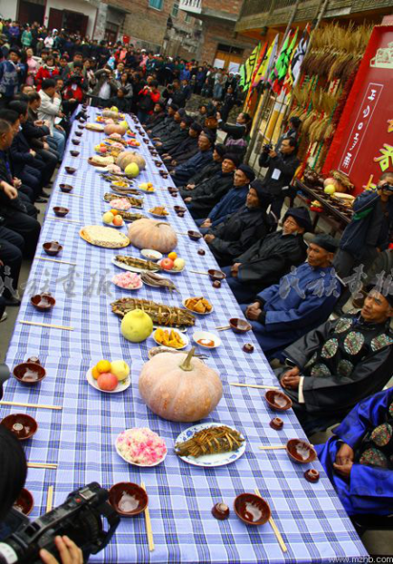 水族以大米為主食,喜愛(ài)糯食,此外,水族還種植一些小麥、包谷、小米、紅稗、紅薯及飯豆等雜糧作輔助糧。糯米飯是節(jié)慶主食,也用于祭祀,故又戲稱“鬼米”。水果有李、橙、橘、桃、梨和楊梅,還出產(chǎn)麥冬、杜仲等各種藥材。水族農(nóng)民不善種菜,因而蔬菜品種比較單調(diào),青菜、廣菜及大葉韭菜是最常見的蔬菜。水族比較重視養(yǎng)殖業(yè)和漁業(yè)。水族酸湯極有特色,有辣酸、毛辣酸、魚酸、臭酸等多種。極少有炒菜,一年四季都吃酸湯“火鍋”。即使偶有豆腐、肉或魚,也習(xí)慣加入菜中,煮成一鍋沾蘸水吃。吳茂釗《水族食俗點(diǎn)滴》一文指出,輪流坐莊就是熱情好客的文化表露。水族宴席上以雞、鴨、豬頭為尊,特別喜歡吃魚。水族特色飲食還包括水族特制的豬頭、豬腿、雞、鴨腿、糯米飯、粽粑、魚包韭菜、煮活魚等美食。對(duì)于水族人民而言,“吸煙重于喝茶,飲酒重于吃肉”。水族婚、喪、壽宴簡(jiǎn)易,有“吃酸”的習(xí)俗(圖為水族節(jié)日盛宴。席間的“魚包韭菜”是祭祖儀式的必備之菜。引自民族畫報(bào))。