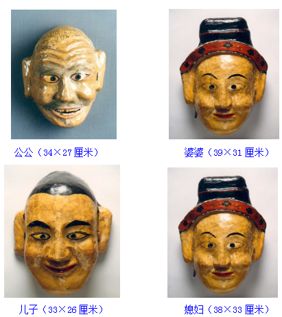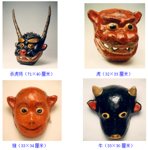 面具,土族語(yǔ)稱(chēng)“面古子”,是土族在表演某些儀式舞蹈時(shí)用以表現(xiàn)一定內(nèi)涵的道具。按形制可分為假面和假頭兩大類(lèi)。其中最具代表性的當(dāng)屬“納頓”節(jié)日當(dāng)中使用的面具。民族文化宮博物館珍藏了三組土族“納頓”面具,分別為表演“莊稼其”時(shí)的公公、婆婆、兒子、媳婦的假面面具;表演“殺虎將”時(shí)的殺虎將、虎、猴、牛的假面、假頭面具;表演三國(guó)演義人物關(guān)羽、張飛、曹操、呂布的假面面具。面具材質(zhì)均為布胎, 20世紀(jì)80年代征集于青海省海東市民和回族土族自治縣。