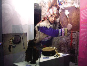 在民族文化宮的展覽中,有一幅大照片——一位老釋比,手拿羊皮鼓,頭戴猴皮帽,表情莊嚴(yán)、凝重。那正是釋比傳人朱金龍。朱金龍這次也來到了北京,把他祖祖輩輩傳下來的釋比文化展現(xiàn)給北京的觀眾。