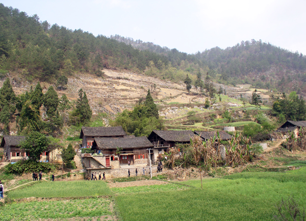 毛南族的村落多依山而立,少占耕地。干欄群落是毛南族村莊的一種布局,但形式不拘一格,根據地形特點而富有變化。有的從山腰往下建成輻射式群落,即幾座房子前后用“天橋”串聯(lián)起來,組成串聯(lián)式干欄群,這是同一宗族兄弟常采用的一種方式。有的則建立并聯(lián)式群落,即由若干間干欄房子排成兩行,中間留一條通道,兩端置圍墻與院門,圍成長形院落。也有從實際地形出,把房屋排成梯級式干欄群或擺成一字長蛇形的。此外,有的在幾座并排的房子中間開通方便門,以利叔伯兄弟及鄰里串門聯(lián)系,相互關照,形成一種向心力。村中巷道皆用石板鋪就。村邊興種竹木擋風,綠化美化環(huán)境。村頭奇特的大樹被視為村、峒守護神樹,神圣不可冒犯,一旦遇有瘟疫等異常事件,病家抑或全村皆到大樹下祭神禳解。各村屯的村背面都有大片護村林,既防石頭滾落,又美化村景,此林不允許隨意砍伐。同時,自然屯大都設立集體活動場所,在水井、溪邊、道旁或大樹下擺放石凳,供人們節(jié)日及閑暇時間聚會、娛樂。