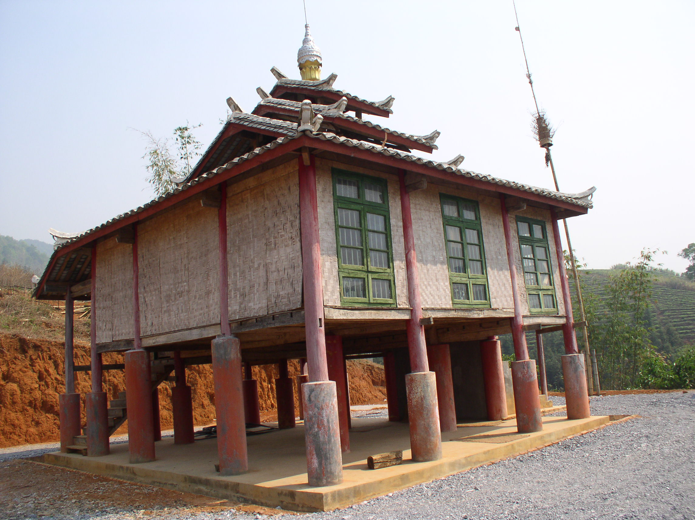 德昂族的家庭民居多為竹木結(jié)構(gòu)、歇山式草頂?shù)母蓹诮ㄖ?,平面有長方形、半圓形、弧形等多種風(fēng)格。干欄式民居分上下兩層,上層住人、下層作畜廄,有主副兩座樓梯。歇山式草頂為圓弧形的民居,當(dāng)?shù)胤Q“氈帽形”,風(fēng)格粗獷。民居構(gòu)架為穿斗式木梁柱,樓面、隔間均用竹片或木板鋪設(shè)。在德宏等地是一家一院,主房樓上住人、煮食、貯藏糧食,樓下關(guān)牲口;附房用作堆放柴草和安裝舂米用的腳碓。鎮(zhèn)康地區(qū)若干小家庭同住一幢房子,房內(nèi)中間有寬敞的走道,兩旁為各小家庭住室,間壁而居,各有火塘,所以竹樓較大,有的占地近400平方米。20世紀(jì)50年代以后,這種竹樓建筑已有改變,現(xiàn)在部分德昂族的住宅與附近漢族的平房一樣。德昂族信仰佛教,有些村莊里建有寺廟,每逢佛事活動人們就來到寺廟里,舉行隆重的儀式。