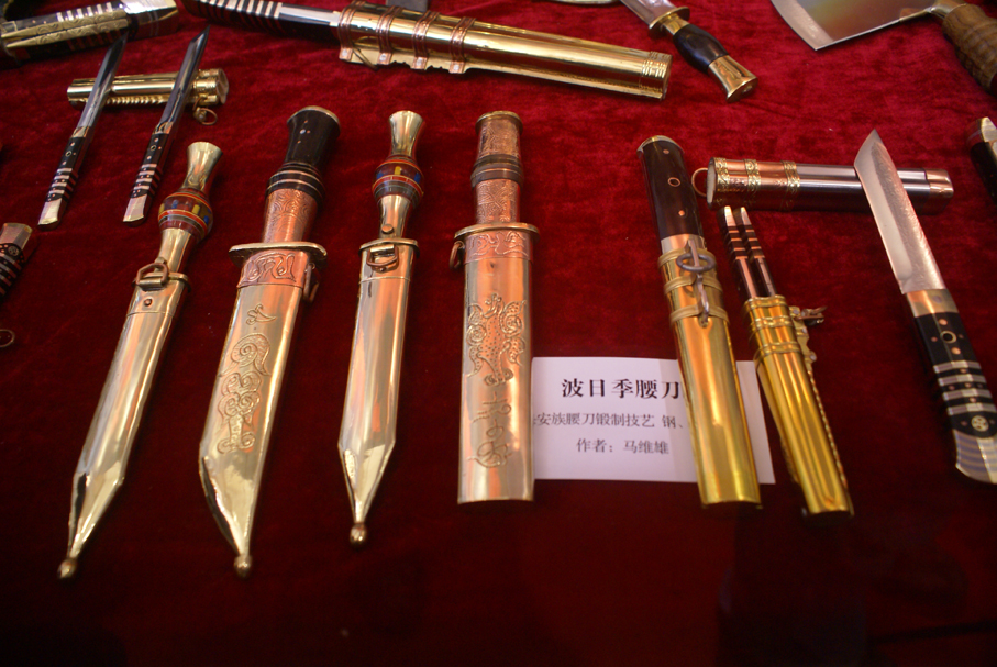 保安腰刀,是保安族的傳統(tǒng)工藝品,由于其打造技藝精悍,與新疆的英吉沙小刀、云南阿昌族的戶(hù)撒刀并稱(chēng)為“中國(guó)少數(shù)民族三大名刀”,在中外都享有盛譽(yù)。保安腰刀品種繁多,有“什樣錦”、“雅五其”、“雙落”、“滿把”、“扁鞘”、“雙刀”、“細(xì)螺”、“波日季”、“哈薩刀”、“蒙古刀”等,刀面上刻 “七顆星”、“五朵梅”、“一條龍”、“一把手” 等圖案,這些圖案通常為鐵匠代號(hào),即一看刀面團(tuán)就知道是哪位鐵匠所制,而有的圖案則是記載保安鐵匠的遭遇。保安腰刀中,最為漂亮的要數(shù)“什樣錦”,“波日季”則名氣最大。