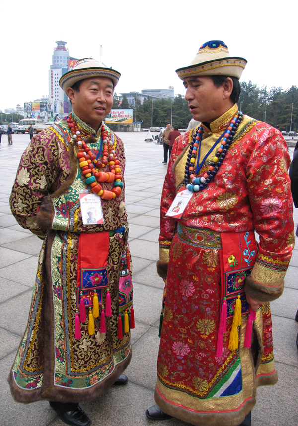男子服飾比較簡(jiǎn)單。一般裕固族男性頭戴金邊白氈帽,帽檐后邊卷起,后高前低,呈扇面形。也有的帽檐鑲黑邊,帽頂正中有用藍(lán)緞金線(xiàn)織成的圓形或八角形圖案;身穿大領(lǐng)偏襟長(zhǎng)袍,質(zhì)地多用布、綢、緞和紫紅色氆氌等料縫制,腰間扎大紅腰帶,下身穿單褲,冬季穿用牛皮自己縫制的皮窩子或高腰的皮“亢沉”,穿毛襪。無(wú)論單、棉衣衣襟上都用彩色布或織錦緞鑲邊,還有用水獺皮鑲外邊的。單、夾袍下擺左右開(kāi)衩,在衣衩和下擺處鑲邊,老人的長(zhǎng)袍下擺左右均不開(kāi)衩。