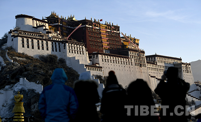 圖為2月5日,游客在藥王山觀景臺,迎接新年第一天第一縷陽光灑向布達(dá)拉宮。