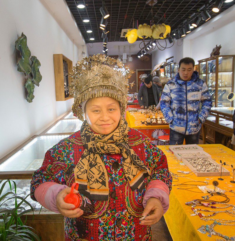 “苗奶奶”楊玉芬,苗族,今年54歲,貴州凱里人,玉芬民族工藝品有限公司總經理,第一個在西安回民街做銀飾生意的南方人。當有人問她貴州和西安哪個更好時,她總是用一句話來打發(fā):“都好,我就是像(西安)本地人啊?!?/p>