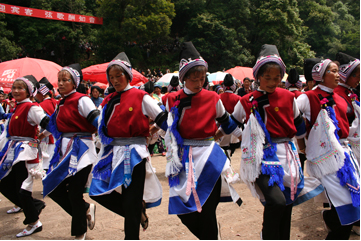 以大理市為主要代表的洱濱區(qū)白族服飾。如周城、喜洲、挖色等白族服飾,他們世代伴水而居,生活環(huán)境十分優(yōu)越,服飾給人一種清新明快的感覺。在很大程度上折射出這種環(huán)境的優(yōu)越性,周城村白族男服飾過去的穿著較為復(fù)雜,纏白布包頭,上衣穿立領(lǐng)對襟布紐衣,俗稱“三滴水”,最里的一件穿白色、中間一件穿藍(lán)色、最外一件穿黑色或是藏青色的外衣,三件衣服都是敞開著,露出內(nèi)穿的兜肚,外穿一件麂皮或山羊皮的領(lǐng)褂,下穿白或藍(lán)色大襠褲,腳穿布底剪口鞋。肩掛繡花掛包。而現(xiàn)在的男裝基本與漢族相同,平時(shí)需要穿戴的民族服裝也是改良過較為簡潔的男裝,只有在重大節(jié)日的時(shí)候才能看到傳統(tǒng)的著裝風(fēng)采。而女裝的穿戴至今還保持得較為完整,以白、藍(lán)兩色為主,沿承了白族崇尚白色的傳統(tǒng)特點(diǎn),上身穿白色緊袖裳,外套紅或藍(lán)色右衽領(lǐng)褂,在領(lǐng)褂的紐扣上掛三須或五須銀鏈,銀鏈上綴掛件,有銀質(zhì)的針筒、魚、牙簽、耳勺。手戴金、銀或玉手鐲、戒指。耳戴金、銀耳墜。手袖上套滾邊的大袖小袖,并在袖上鑲各式花邊。腰系繡花短圍裙或系凈白色底外鑲一圈黑色邊的素面短圍腰。下穿白或藍(lán)色滾邊長褲,褲腿邊鑲寬窄花邊,花邊上面繡各類花卉圖案。腳穿繡花尖鞋,又名“白姐鞋”(“柏姐鞋”),鞋面為紅、粉、綠、黑等色,繡有艷麗的花紋。頭飾和過去的頭飾相比較從美術(shù)的角度上看要美得多,特別是姑娘的頭飾,過去傳統(tǒng)頭飾一般喜戴魚尾帽,還有我們在電影《五朵金花》中所看到過的姑娘頭飾,而今姑娘的頭飾讓人一看就聯(lián)想到大理的“風(fēng)花雪月”四大美景。頭戴色彩鮮艷的繡花頭巾,繡花頭帕上端精心梳理出茂密雪白的絨毛,形象的表現(xiàn)了蒼山頂上的皚皚白雪,將發(fā)辮盤繡花頭帕外,纏以大紅絨線,形如滿月,一側(cè)垂下雪白的纓穗飄飄灑灑,象征著終年吹拂的下關(guān)風(fēng)。整套服飾在很大程度上折射出這種環(huán)境的優(yōu)越性,如色彩搭配對比鮮明,簡潔明快,挑花精美,毫無細(xì)碎之感,裝飾繁而不俗等。