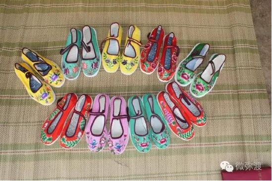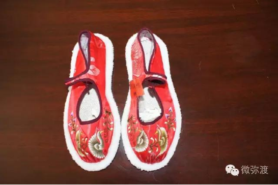 繡花鞋分大口鞋、小口鞋兩種。大口鞋大方素雅,小口鞋古樸艷麗?;佑小胺遐s梅”、“喜鵲登枝”、“獅子滾雪球“、“鳳穿牡丹”和彝族人民結(jié)婚時(shí)候,按當(dāng)?shù)仫L(fēng)俗所需必須穿的“毛邊底”等。這些花樣圖案具有不為時(shí)代變幻所動(dòng)的恒久性質(zhì),蘊(yùn)藏著濃厚的傳統(tǒng)民俗文化。它給予人們的絕不僅僅是絢麗悅目的美感,還是彝民們征服自然,繁衍生息,爭(zhēng)取愛(ài)情和歡樂(lè)的記錄。