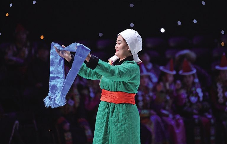 內(nèi)蒙古藝術學院的學生在舞臺上展示蒙古族禮服。