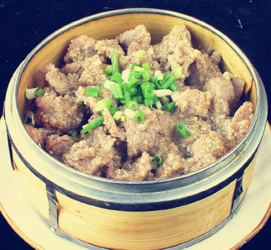 粉蒸肉以肉為主料,采用米粉和其他調味料制作而成。粉蒸肉糯而清香,酥而爽口,有牛肉、排骨、豬舌、牛肚、肥腸、羊肉等不同選擇,味道也根據(jù)個人喜好在辣椒碟中添加醋、糖、麻油等調味料,粉蒸肉味道鮮美、口感松軟、回味無窮。