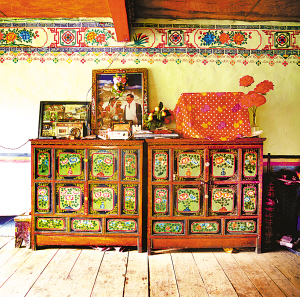 房屋大都是3層,上層存放干草和秸桿,下層關(guān)養(yǎng)牲畜,中間一層是居室。居室用木板隔間,里間較小是已婚子女住的,外間寬敞,是多功能堂屋。臨窗處設(shè)火塘,以利排煙,是家庭生活中心和待客之處。火塘上架著碩大的鐵三角架,上面是六七厘米寬的鐵板圈,擦得錚亮,能烤制食物。墻角處供奉佛像,擺放領(lǐng)袖像。房門安設(shè)木鎖,用十幾厘米的木鑰匙開啟,都是由硬木刻制,光滑耐用。