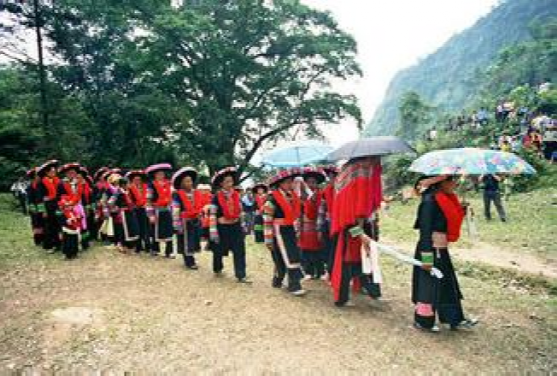 這里的"女婚男嫁"特點(diǎn),大體上有這么幾個(gè)階段。當(dāng)男女青年都長(zhǎng)到18歲后,就開始講究修飾,喬裝打扮一新,女青年似花蕊朵朵,男青年個(gè)個(gè)英俊瀟灑。通過(guò)趕街、走親訪友、耍老表、節(jié)假日唱山歌,打陀螺,拋毽子等方式,進(jìn)行談情說(shuō)愛(ài),互相了解,這是認(rèn)識(shí)階段。在認(rèn)識(shí)基礎(chǔ)上,雙方互請(qǐng)到家做客,彼此進(jìn)一步掌握對(duì)方為人、性格,家庭成員,家庭經(jīng)濟(jì)等情況。這是加深認(rèn)識(shí)、了解、建立愛(ài)慕之情階段。每逢農(nóng)忙季節(jié)和節(jié)假日,女方總要請(qǐng)男方來(lái)幫助犁地、耙田,耕種,收割,蓋房子等,這是考察對(duì)方勤勞能干還是好逸惡勞階段,是最關(guān)鍵的階段經(jīng)過(guò)一兩年的交往接觸,雙方產(chǎn)生了深厚感情,女方就偷偷買布,精心地打好精致的布鞋送給男方,男方收到信物后,就選擇買手鐲、頭簪、戒指,耳環(huán)或手表等其中的一兩件送給女方,彼此作為定情物,確定自己的心上人。但是,這些交往仍然是在秘密的條件下進(jìn)行,屬保密階段。經(jīng)過(guò)以上四個(gè)階段以后,女方便請(qǐng)男方派老人帶上幾斤酒,糖,一些煙餅等禮品來(lái)訂親,要求上門,將婚事公布于眾,從這以后,女方就負(fù)責(zé)籌備一切嫁妝、床上用品、家具等。待東西備齊,女方就擇日接男方過(guò)門。