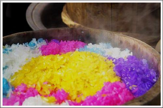 節(jié)日之前,苗族婦女就從山上采集楓葉和野榛葉,用鐵鍋煮開(kāi),倒進(jìn)盆子,冷卻后,將白花花的糯米放入盆子浸泡。節(jié)日當(dāng)天早上,苗族婦女們?cè)缭缙饋?lái),將裝有染色糯米的木箕放在三腳架的鐵鍋上,燒起火慢慢地蒸。約一個(gè)小時(shí)過(guò)后,木箕里的糯米蒸熟成糯米飯,散發(fā)滿屋的芳香。這時(shí),苗族婦女就將糯米飯倒進(jìn)飯盆,用手前后翻轉(zhuǎn),直到糯米飯里的水蒸氣全部散發(fā)。