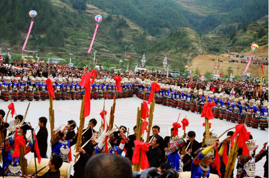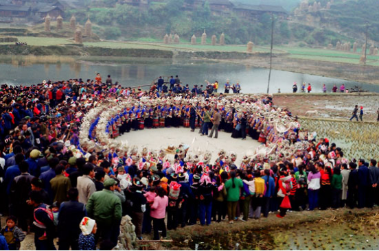 貴州雷山苗族至今仍保留“以十月為歲首”的紀(jì)年法。每年的農(nóng)歷十月,雷山苗寨一派歡騰,開(kāi)展極富特色的辭舊迎新活動(dòng)。