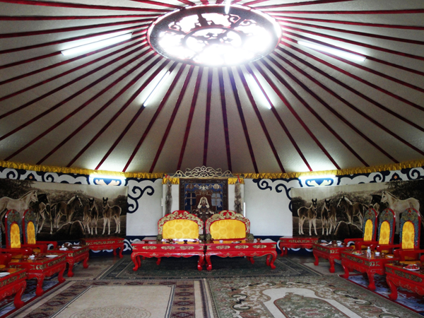 早先,蒙古人逐水草遷移,以氈帳為居室,所以蒙古人對制作氈帳有很高的技術(shù)。當(dāng)?shù)啬撩竦臍謳び冒酌珰指采w,毛氈上面涂以石灰或白粘土和骨粉,使之更為潔白,有時也把毛氈涂成黑色。覆蓋在天窗周圍的毛氈,飾以各種圖案,門口懸掛著繡有各種顏色圖案的毛氈。大汗及諸王的氈帳則涂上金色,舉行宴會的氈帳可容納2000人。金帳之稱謂也由此而來【老鐵供圖】。
