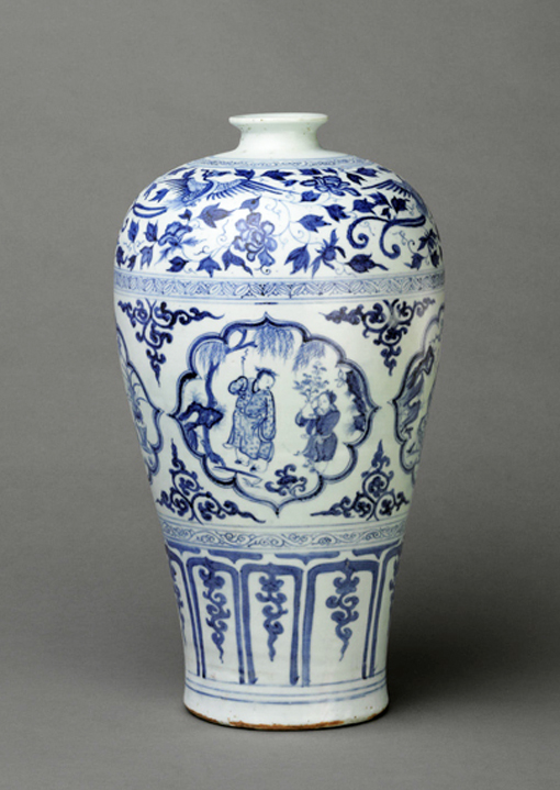 裝飾繁密是典型元青花的重要特點,它們由細(xì)巧的文化組成若干條帶環(huán)繞器身,裝飾帶數(shù)量通常很多,但惟獨沒有7層的,因為這個數(shù)字和蒙古族的喪葬與元代的刑罰有關(guān)。相反,9層裝飾帶的元青花卻為數(shù)不少,而這與蒙古族重九顯然有著直接的聯(lián)系【圖為元代后期青花四愛圖梅瓶。湖北省博物館藏】。