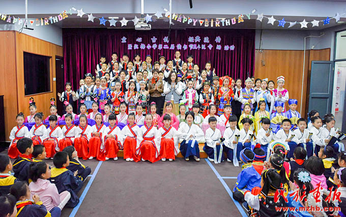 同一天下午,一場精彩的T臺秀在上海市閔行區(qū)梅隴鎮(zhèn)弘梅小學(xué)上演。小學(xué)生們身著民族服裝亮相,動感的音樂、精彩的表演,將“民族團結(jié)一家親”的理念演繹得生動活潑。學(xué)校布置的民族文化墻上,展示了我國56個民族的風(fēng)土人情,營造了多姿多彩的民族文化氛圍,讓民族特色文化陪伴在學(xué)生身邊。