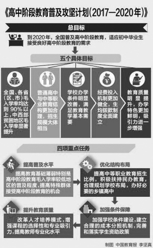 “高中教育是選擇性教育,僅僅提供學位,缺乏吸引力,學生不愿意上,普及目標就難以實現(xiàn)?!苯逃肯嚓P負責人解釋說,在確保普及程度的基礎上,要體現(xiàn)全面科學的普及觀,防止簡單追求數(shù)量和規(guī)模的增加。因此,除了2020年我國高中階段教育毛入學率將要達到90%這個總目標外,《攻堅計劃》還提出了5個具體目標: