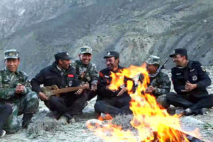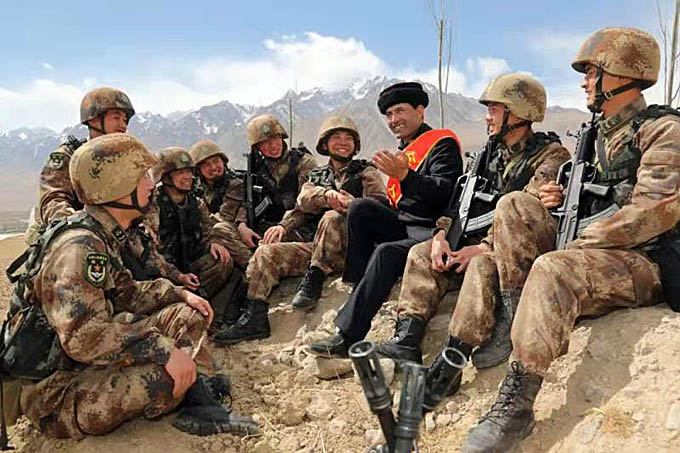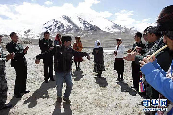 拉齊尼·巴依卡和邊防戰(zhàn)士一起與當(dāng)?shù)啬撩袢罕娐?lián)歡。(新華社記者 李翔 攝影)