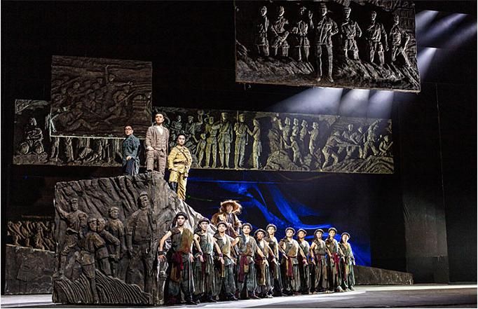 在舞蹈語言的設(shè)計上,編導(dǎo)融入當代元素,使觀眾不但感受到審美的親切與現(xiàn)代感,而且還自然地進入回望歷史的情境,對其思想內(nèi)涵的理解更為準確。該劇的道具使用和調(diào)度也頗為大氣,令人印象深刻。一組斜坡狀的大型舞臺道具不但由群眾演員直接移動而實現(xiàn)即時的場景調(diào)度,還可使演員上下和左右而行,最終組合成巨大的中國共產(chǎn)黨黨徽,輔助完成了人民英靈和英雄的形象塑造。