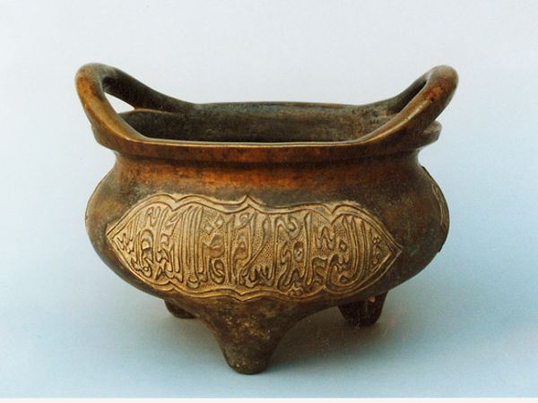 侈口、方唇、窄卷沿、矮束頸、扁鼓腹,口沿立一對橋形耳,底部以矮小的三乳足支撐整個爐身。外腹壁兩大兩小四組開光內均以珍珠紋為底,陽刻有阿拉伯文字,漢譯為:“最貴的記主詞(吉克爾)是念清真言(萬物非主,唯有真主,穆罕默德是真主的使者)”,底款漢文四字篆書“宣德年制”。阿拉伯文構成此爐的主體紋飾,圖案別致,內涵深奧,寓意獨特,雕刻手法精細、嫻熟,線條婉轉流暢,自然雅致,具有韻律之美。該器物銅質精良,造型優(yōu)美,工藝考究,將冶鑄、雕刻技術與阿拉伯文書法絕妙融合,堪稱回族文物中的珍品。