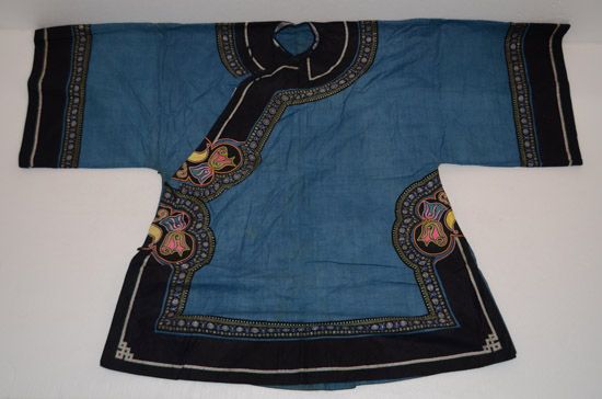 分布在臺江、施秉、鎮(zhèn)遠(yuǎn)三縣交界地一帶苗族村寨,以臺江施洞苗族為代表。該服裝上衣為家織布右衽衣,刺繡主要在前襟、衣領(lǐng)、肩袖部分,以黔東南苗族特有的破線繡為主,所繡圖案主要為龍紋,工藝精美,具有民族特點(diǎn)。