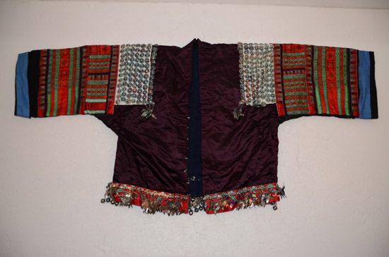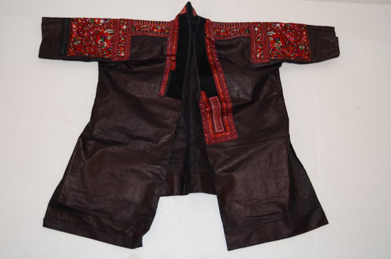 分布在凱里、雷山、丹寨、麻江四縣交界地一帶苗族村寨,以凱里舟溪苗族為代表。該服裝上衣為緞面對襟衣,刺繡主要在肩袖及袖口部分,以黔東南苗族特有的繭片繡為主,所繡圖案為浮萍花和幾何紋,肩部和背部鑲有銀泡和銀片,具有民族特點(diǎn) 。前、后圍腰片均以繭片繡為主,所繡圖案為浮萍花和幾何紋。