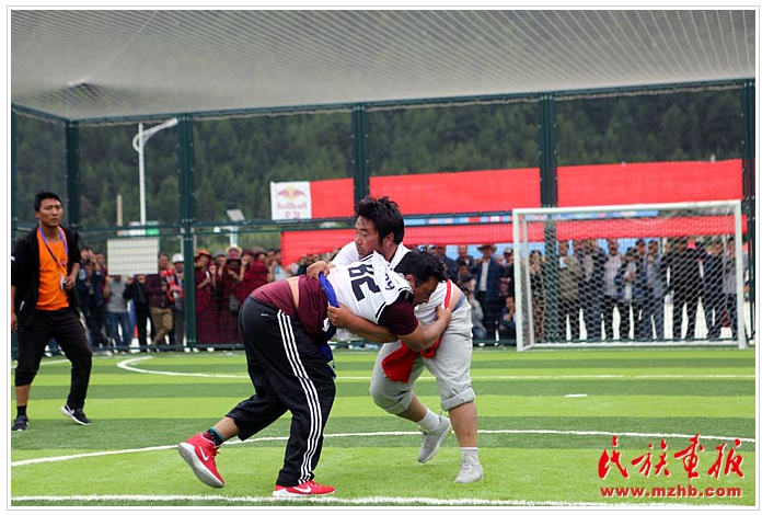 甘肅省甘南藏族自治州的迭部縣安多地區(qū)則巴邀請(qǐng)賽男子摔跤80公斤以上比賽(民族畫報(bào)記者 黃若天 攝影)