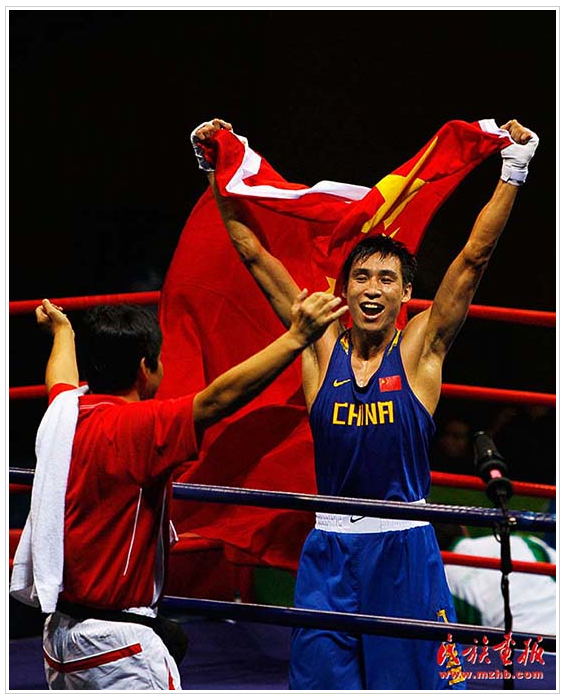 蒙古族拳擊運(yùn)動(dòng)員張小平獲北京奧運(yùn)拳擊比賽金牌(民族畫報(bào)資料)