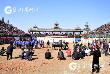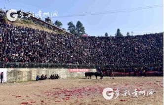 貴州省從江縣第十五屆原生態(tài)侗族大歌節(jié)的前一天,恰逢該縣逢亥斗牛日,丙妹鎮(zhèn)松學(xué)斗牛塘、谷坪鄉(xiāng)四寨河斗牛塘同時(shí)舉辦傳統(tǒng)牛王爭(zhēng)霸賽,喜迎一年一度“侗族大歌節(jié)”的到來,共有來自周邊村寨的80頭水牯牛參戰(zhàn),斗?;顒?dòng)場(chǎng)上名牛角逐,場(chǎng)面異彩紛呈,吸引數(shù)萬名觀眾前來觀戰(zhàn)。