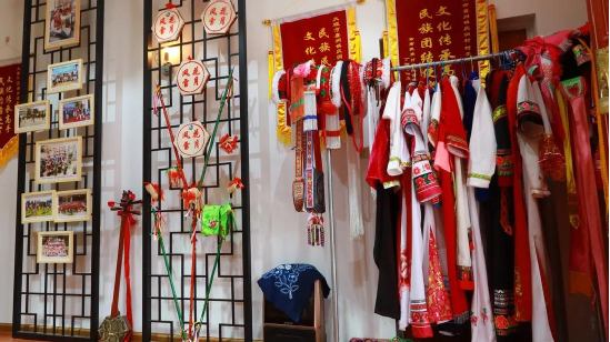 方正的堂屋里掛滿了何松康參加演出、培訓(xùn)的各種照片及霸王鞭、八角鼓、服裝等演出道具。院子的墻上專門請人繪了一幅霸王鞭的彩繪,旁邊書寫:“弘揚(yáng)白族傳統(tǒng)文化,傳承民間舞蹈藝術(shù)”。