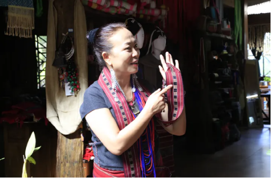 娜紅是勐梭鎮(zhèn)他朗村十組的老婦女主任,十多歲起開(kāi)始學(xué)習(xí)佤族織錦技藝,隨后加入了李憲蘭工作室?!拔铱靠椮翦\為家里織出了兩層樓房?!蹦燃t感恩佤錦技藝為家里帶來(lái)的改變,從前是白天勞動(dòng),晚上織布,一年只能賣得2000元?,F(xiàn)在,每個(gè)月可以拿到3000元工資,年底還有分紅,日子越來(lái)越有盼頭。