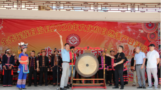 “擊鑼開市”“山歌傳情”“瑤醫(yī)問診”“吃樹葉豆腐”“跳黃泥鼓舞”,6月13日,廣西來賓市金秀瑤族自治縣2020年“文化和自然遺產日”——“非遺集市”活動在羅香鄉(xiāng)橫村瑤寨拉開序幕。廣西壯族自治區(qū)非物質文化遺產保護中心書記朱鳳立、金秀瑤族自治縣人民政府副縣長馬峰為“非遺”集市“擊鑼開市”。