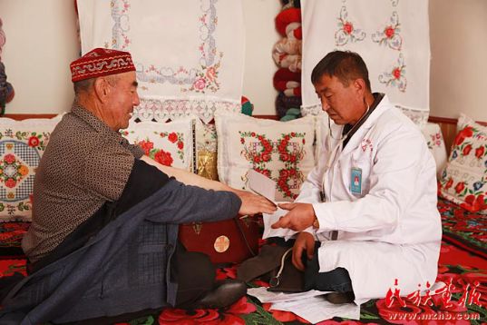 大山里由于情況特殊,有很多孩子是居馬泰·俄白克接生的,名字都是他給起的,經(jīng)常能聽到孩子叫他“醫(yī)生爸爸”。在江蘇援疆醫(yī)生的“傳幫帶”下,居馬泰·俄白克系統(tǒng)地學習了中醫(yī)針灸技術(shù)。掌握新診療技術(shù)后,他立即奔赴包扎墩冬牧場開展巡診。他還前往阿勒泰地區(qū)參加哈薩克醫(yī)診療技術(shù)培訓,提升了自己的診療技術(shù)水平。每年春天,包扎墩庫克蘇溫泉衛(wèi)生院又會迎來大批患者,為不耽擱放牧,牧民常常早晨8時就來找他看病、輸液。居馬泰·俄白克一忙就是一天,到晚上他還要為受診治牧民建立醫(yī)療檔案,每天都要忙到深夜。