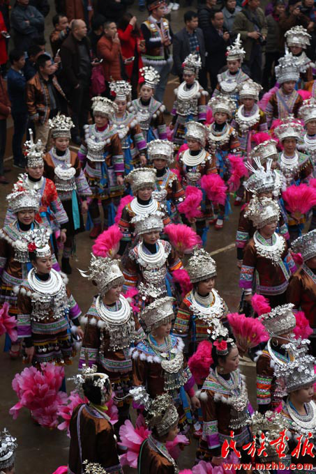 “‘打同年’活動現(xiàn)在是一年一個樣,從參加活動的苗族同胞服裝上的變化就能感到大家生活水平的提高?!睆V西壯族自治區(qū)融水苗族自治縣蘆笙協(xié)會會長鳳紹明興奮地說道。